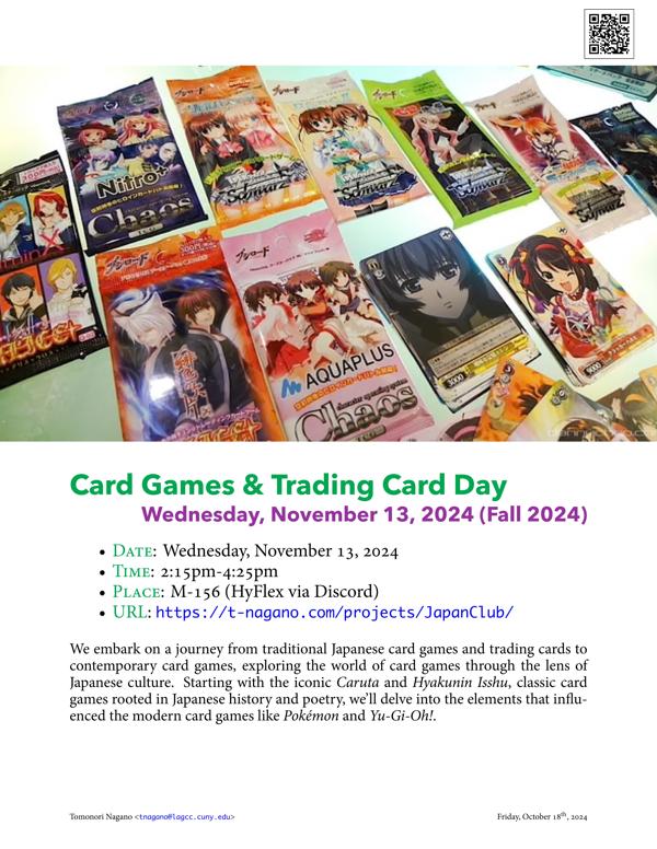 - Description: We embark on a journey from traditional Japanese gard games to contemporary card games, exploring the world of card games through the lens of Japanese culture. Starting with the iconic Caruta and Hyakunin Isshu, classic card games rooted in Japanese history and poetry, we'll delve into the elements that influenced the modern card games like Pokémon and Yu-Gi-Oh!.