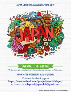 - Description: The Japan Club is pleased to host a Japanese calligraphy workshop on Wednesday, April 3, 2019 (2:15pm-4:25pm @ Room M-158). All LaGuardia students are welcome! See https://www.facebook.com/ groups/japanclub.lagcc/ or contact LaGuardiaJapanClub@gmail.com for more info.