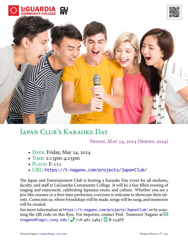 - Description: The Japan Club is pleased to host a Karaoke Day event on Wednesday, November7, 2018.AllLaGuardiastudentsarewelcome!Enteryour song request at https://bit.ly/2yQiifl. See https://www.facebook.com/groups/japanclub.lagcc/ for more info.
