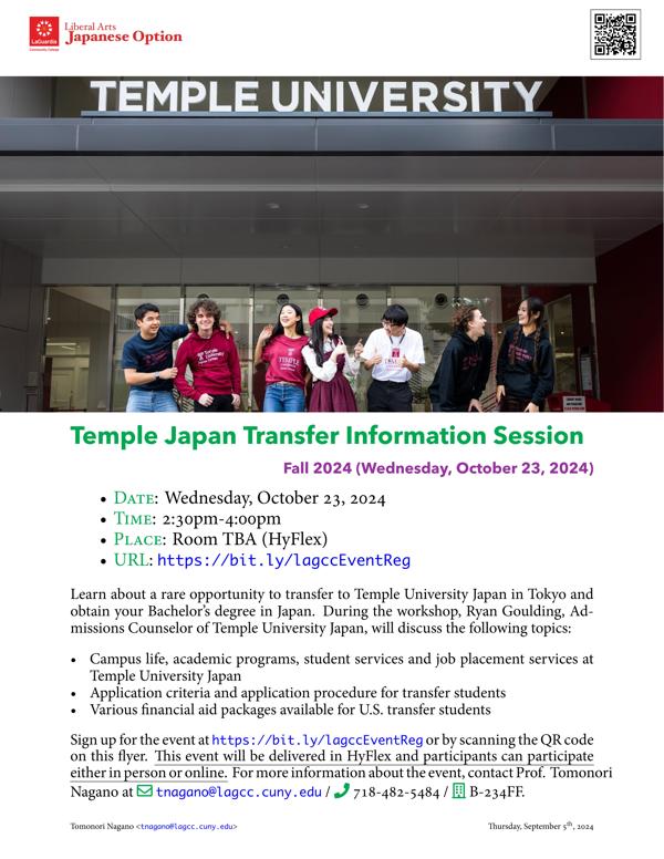 - Description: Learn about a rare opportunity to transfer to Temple University Japan in Tokyo and obtain your Bachelor's degree in Japan. During the workshop, Ryan Evan Goulding, Admissions Counselor of Temple University Japan, will discuss the following topics: Campus life, academic programs, student services and job placement services at Temple University Japan, Application criteria and application procedure for transfer students, and Various financial aid packages available for U.S. transfer students. Sign up for the event at https://bit.ly/lagccEventReg or by scanning the QR code on the flyer.